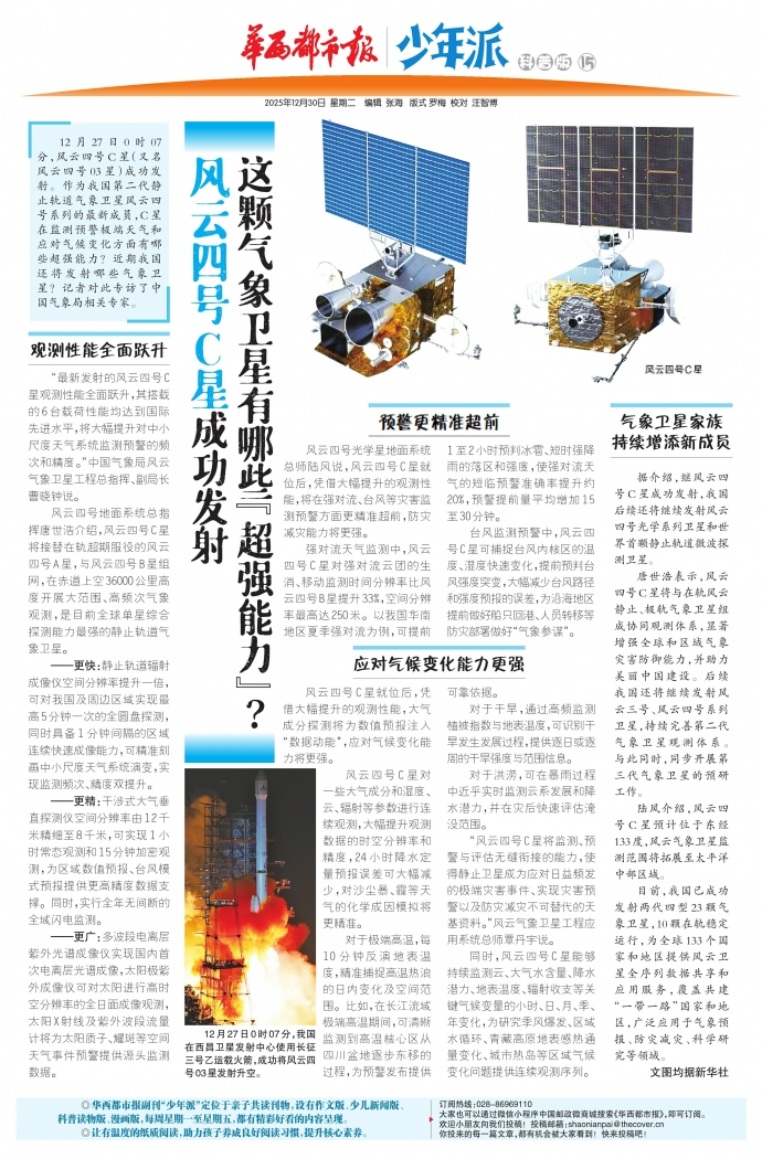 12月27日0时07分,风云四号C星(又名风云四号03星)成功发射。作为我国第二代静止轨道气象卫星风云四号系列的最新成员,C星在监测预警极端天气和应对气候变化方面有哪些超强能力?近期我国还将发射哪些气象卫星?记者对此专访了中国气象局相关专家。