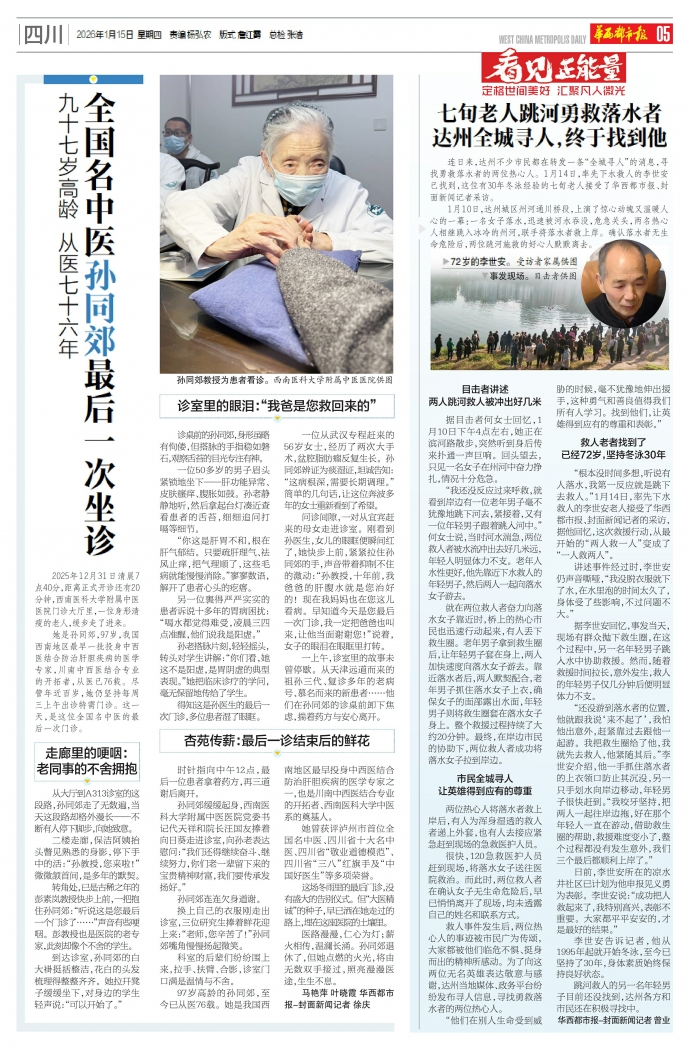 她是孙同郊,97岁,我国西南地区最早一批投身中西医结合防治肝胆疾病的医学专家,川南中西医结合专业的开拓者,从医已76载。尽管年近百岁,她仍坚持每周三上午出诊特需门诊。这一天,是这位全国名中医的最后一次门诊。