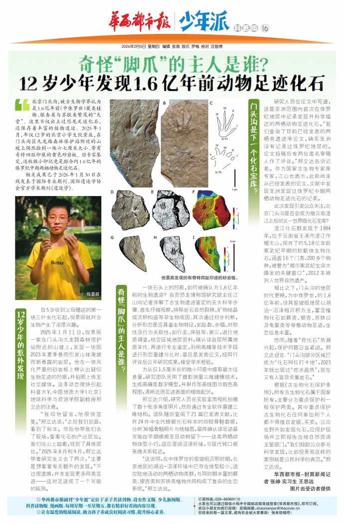 北京门头沟,被古生物学界认为是1.6亿年前(中侏罗世)蕨类植物、银杏类与苏铁类繁茂的“天堂”。这里不仅出土过恐龙足迹化石,还保存着丰富的植物遗迹。2025年1月,年仅12岁的北京小学生倪景辰,在门头沟区九龙路森林保护站附近的山坡上偶然捡到一块六七厘米大小、带有奇特四趾印痕的黄色砂岩板。经专家鉴定,这枚微小印记竟是距今约1.6亿年的侏罗纪中期两栖动物足迹化石。