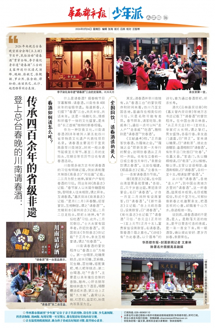 从川南“请春酒”,各地“走人户”,到中国台湾地方志里的“请春酒”,这一杯春酒,筵席或丰或简,名目或雅或俗,形式千变万化,可那份借新春之机邀聚亲友、把酒言欢的心意,却隔着千山万水,奇迹般地一致。