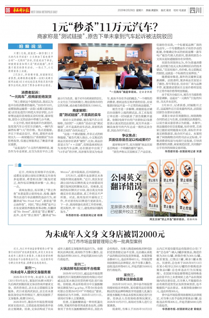 近日,内江市市场监督管理局公布“春雷行动2026”首批典型案例,涉及文身店向未成年人提供文身服务、火锅店经营的鲜毛肚检验不合格等违法行为。这些案件均与群众切身利益、消费安全息息相关。