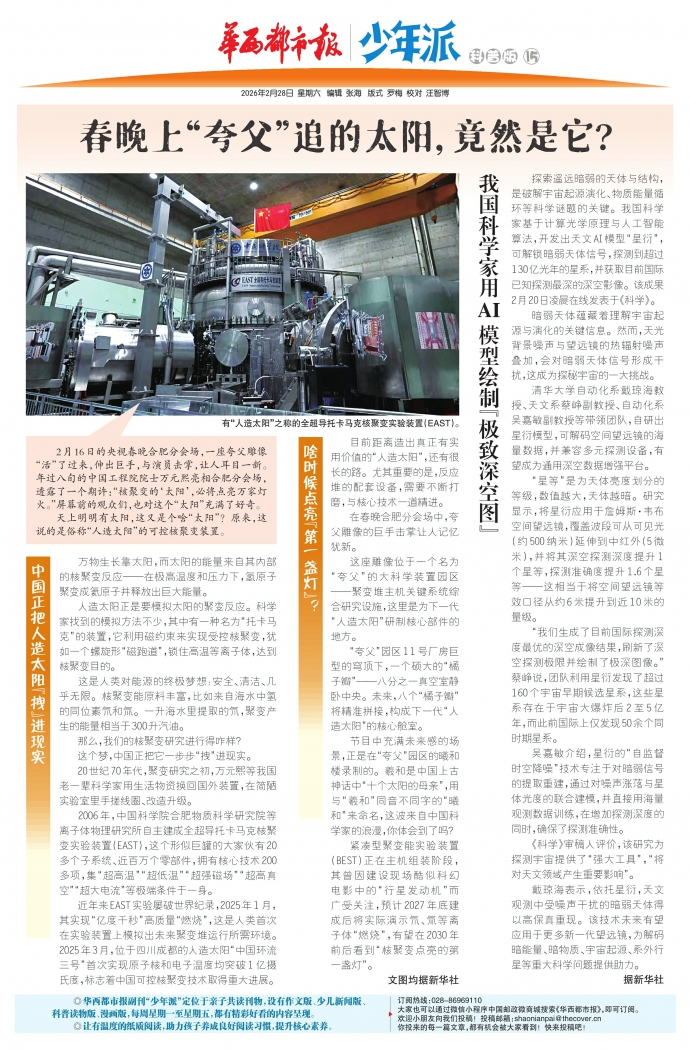 2月16日的央视春晚合肥分会场,一座夸父雕像“活”了过来,伸出巨手,与演员击掌,让人耳目一新。年过八旬的中国工程院院士万元熙亮相合肥分会场,透露了一个期许:“核聚变的‘太阳’,必将点亮万家灯火。”屏幕前的观众们,也对这个“太阳”充满了好奇。