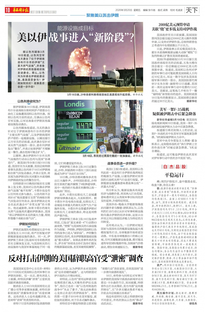 新华社华盛顿3月19日电 据美国有线电视新闻网19日报道,美国一架F-35战机疑似被伊朗火力击中后紧急降落。 报道援引两名知情人士的话说,这架F-35战机在中东美军空军基地紧急降落,飞机疑似被伊朗火力击中。 美军中央司令部发言人蒂姆·霍金斯表示,这架隐形战机在“执行伊朗上空的作战任务”时被迫紧急降落,飞机安全着陆。 报道说,这可能是伊朗在此次美军对伊军事行动中首次击中美国飞机。
