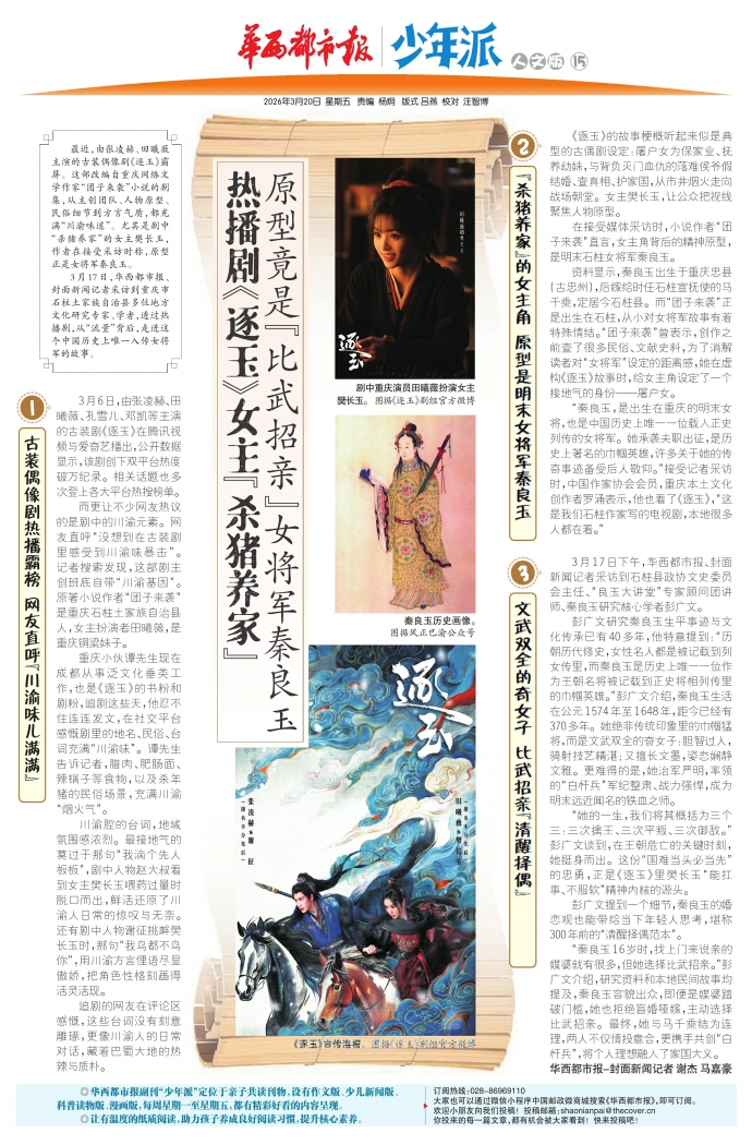 “秦良玉,是出生在重庆的明末女将,也是中国历史上唯一一位载入正史列传的女将军。她承袭夫职出征,是历史上著名的巾帼英雄,许多关于她的传奇事迹备受后人敬仰。”接受记者采访时,中国作家协会会员,重庆本土文化创作者罗涌表示,他也看了《逐玉》,“这是我们石柱作家写的电视剧,本地很多人都在看。”