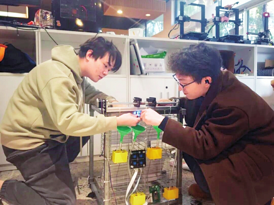 王炳钦(左)和团队成员调试伴宠机器人。受访者供图