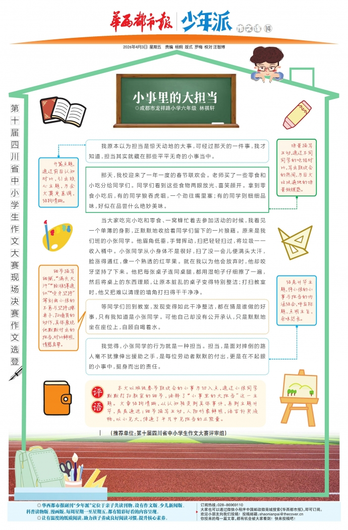 本文以班级春节联欢会的小事为切入点,通过小张同学默默打扫教室的细节,诠释了“小事里的大担当”这一主题。文章结构清晰,从认知转变到具体事件,再到主题升华,层层递进;细节描写生动,人物形象鲜明,语言朴实流畅,以小见大,传递了平凡中见担当的正能量。