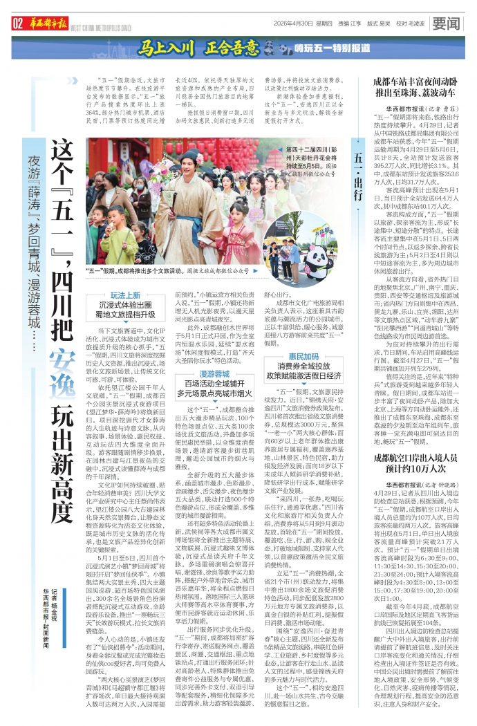 华西都市报讯(记者 钟晓璐)4月29日,记者从四川出入境边防检查总站获悉,根据预测,今年“五一”假期,成都航空口岸出入境人员总量约为10万人次,日均旅客流量约两万人次。旅客高峰将出现在5月1日,单日出入境旅客流量高峰预计突破2.1万人次。预计“五一”假期单日出境客流高峰时段为6:30至9:00、11:30至14:30、15:30至20:00、21:30至24:00;预计入境客流高峰时段为4:30至8:00、13:00至15:00、17:30至19:00,20:00至次日1:00。