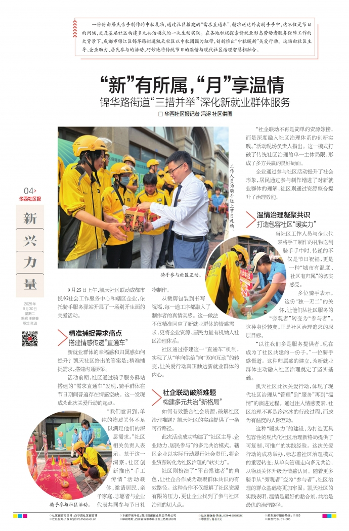 一份份由居民亲手制作的中秋礼物,通过社区搭建的“需求直通车”,精准送达外卖骑手手中,这不仅是节日的问候,更是基层社区构建多元共治模式的一次生动实践。在各地积极探索新就业形态劳动者服务保障工作的大背景下,成都市锦江区锦华路街道凯天社区以中秋团圆为纽带,创新推出“中秋暖新”关爱行动。这场由社区主导、企业助力、居民参与的活动,巧妙地将传统节日的温情与现代社区治理智慧相融合。