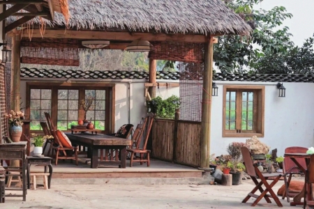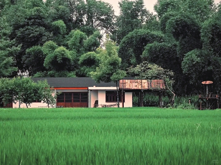 肆野小院:小院隐于林盘,带着古朴的乡村气息,坐在窗边,望着一望无际的稻田,时间仿佛都慢了下来。