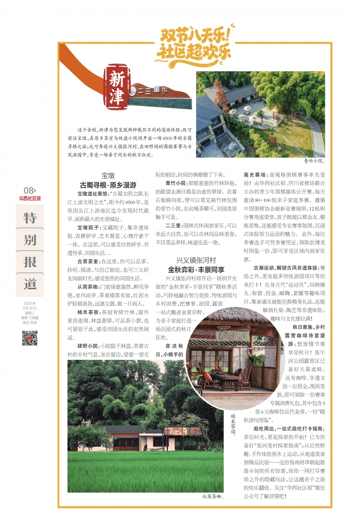 这个金秋,新津为您呈现两种截然不同的漫游体验:既可前往宝墩,在原乡茶室与林盘小院间开启一场4500年的古蜀寻根之旅;也可奔赴兴义镇张河村,在田野间的围棋赛事与古风游园中,享受一场亲子同乐的秋日狂欢。