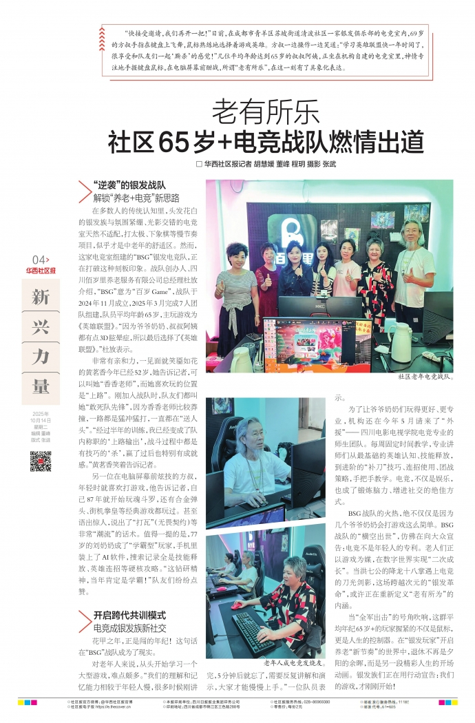 在多数人的传统认知里,头发花白的银发族与氛围紧绷、光影交错的电竞室天然不适配,打太极、下象棋等慢节奏项目,似乎才是中老年的舒适区。然而,这家电竞室组建的“BSG”银发电竞队,正在打破这种刻板印象。战队创办人、四川佰岁里养老服务有限公司总经理杜放介绍,“BSG”意为“百岁Game”,战队于2024年11月成立,2025年3月完成7人团队组建,队员平均年龄65岁,主玩游戏为《英雄联盟》。“因为爷爷奶奶、叔叔阿姨都有点3D眩晕症,所以最后选择了《英雄联盟》。”杜放表示。