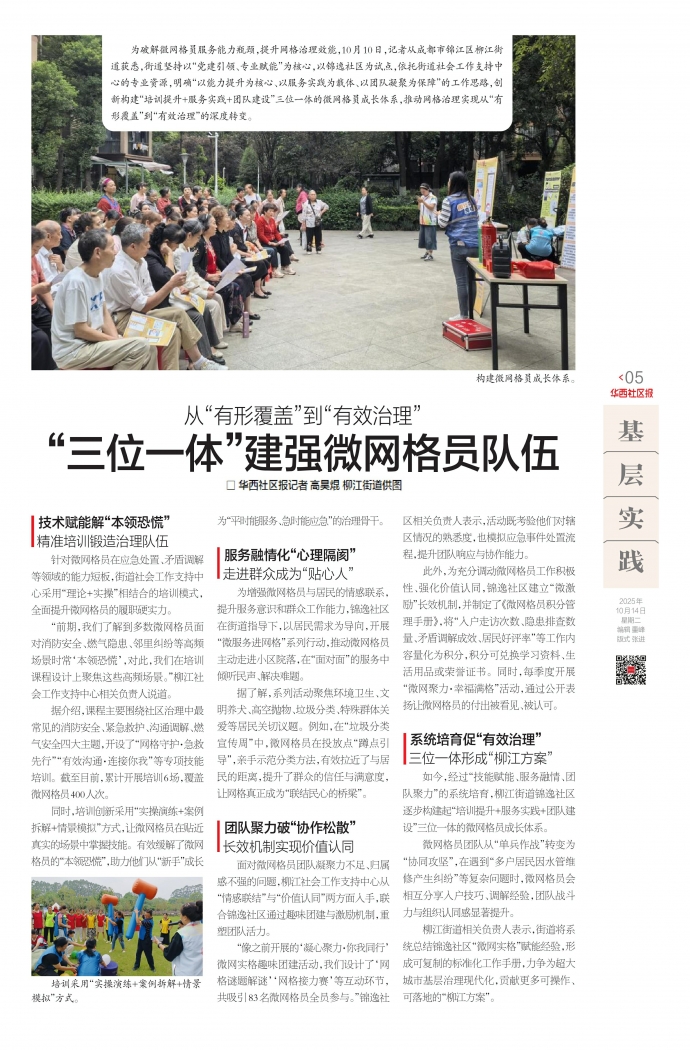 为破解微网格员服务能力瓶颈,提升网格治理效能,10月10日,记者从成都市锦江区柳江街道获悉,街道坚持以“党建引领、专业赋能”为核心,以锦逸社区为试点,依托街道社会工作支持中心的专业资源,明确“以能力提升为核心、以服务实践为载体、以团队凝聚为保障”的工作思路,创新构建“培训提升+服务实践+团队建设”三位一体的微网格员成长体系,推动网格治理实现从“有形覆盖”到“有效治理”的深度转变。