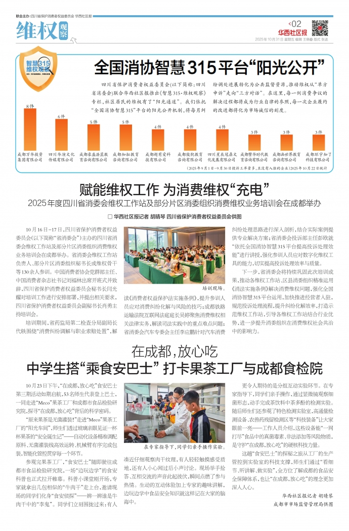 四川省保护消费者权益委员会(以下简称:四川省消委会)联合华西社区报推出《智慧315·维权观察》专栏,社区居民的维权有了“阳光通道”。我们依托“全国消协智慧315”平台的阳光公开机制,将每月纠纷调处进展转化为公共监督资源,推动维权从“单方申诉”走向“三方对话”。在这里,每一例消费争议的解决过程都将成为行业自律的参照,每一次企业履约的改进都将化为市场诚信的刻度。