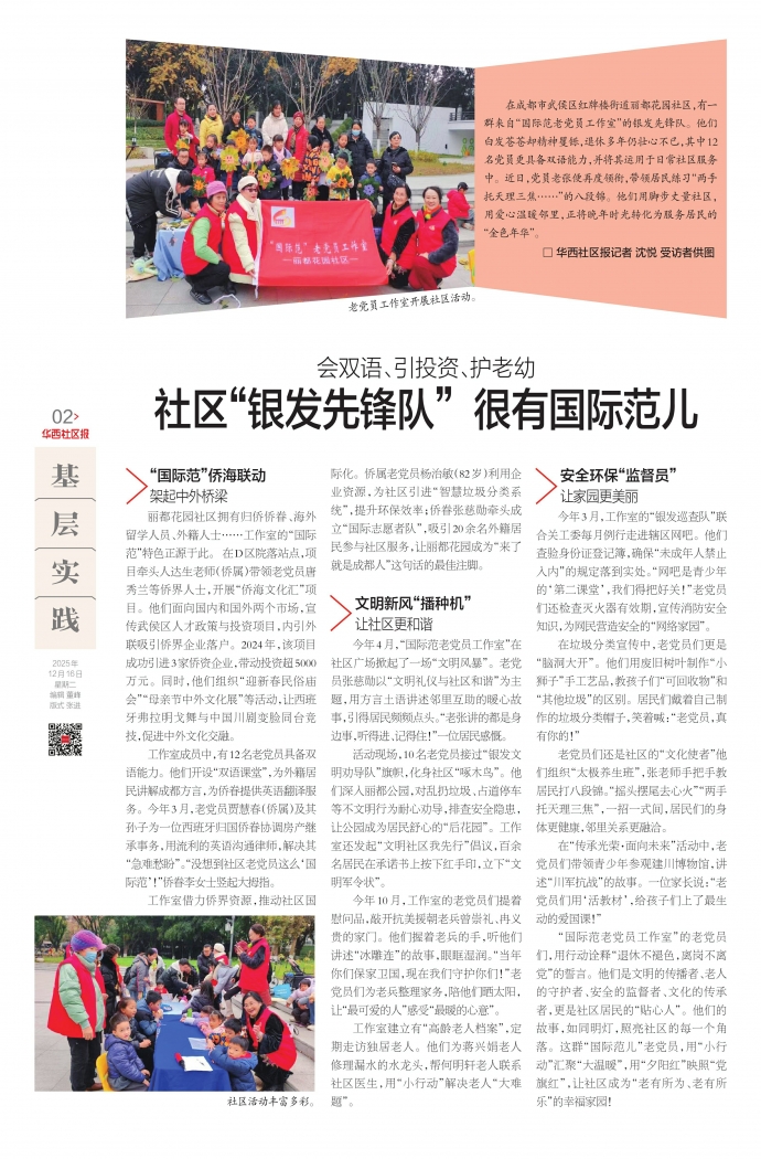 语能力。他们开设“双语课堂”,为外籍居民讲解成都方言,为侨眷提供英语翻译服务。今年3月,老党员贾慧春(侨属)及其孙子为一位西班牙归国侨眷协调房产继承事务,用流利的英语沟通律师,解决其“急难愁盼”。“没想到社区老党员这么‘国