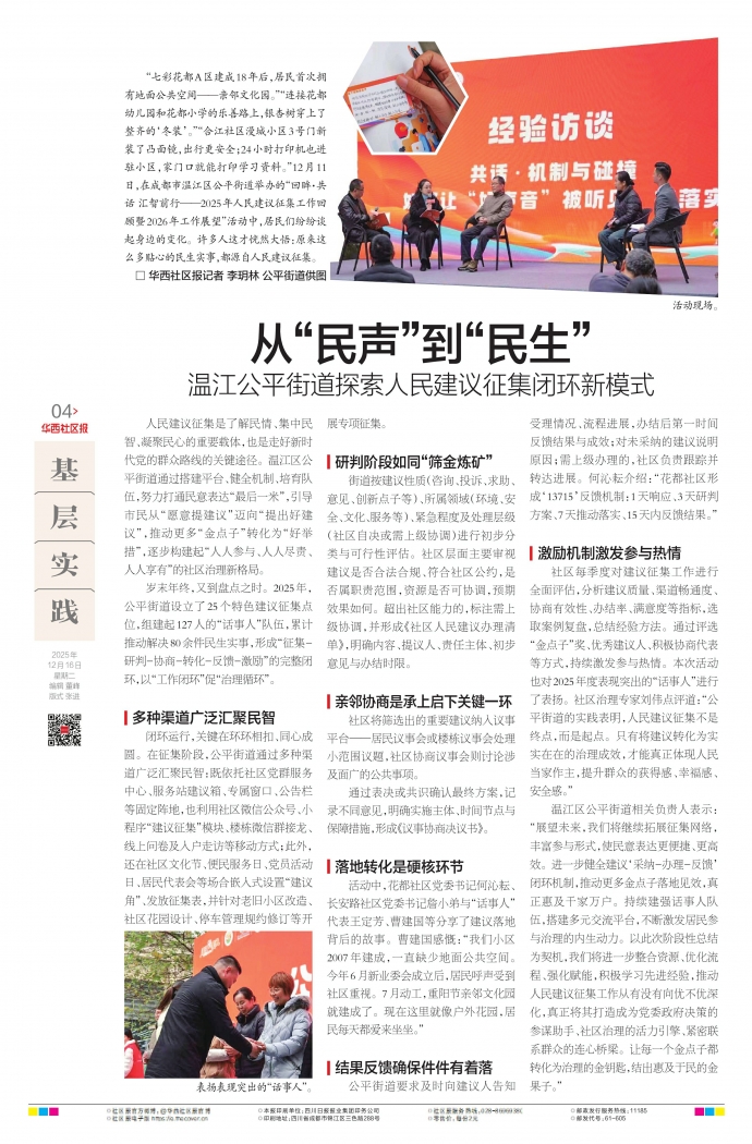 人民建议征集是了解民情、集中民智、凝聚民心的重要载体,也是走好新时代党的群众路线的关键途径。温江区公平街道通过搭建平台、健全机制、培育队伍,努力打通民意表达“最后一米”,引导市民从“愿意提建议”迈向“提出好建议”,推动更多“金点子”转化为“好举措”,逐步构建起“人人参与、人人尽责、人人享有”的社区治理新格局。
