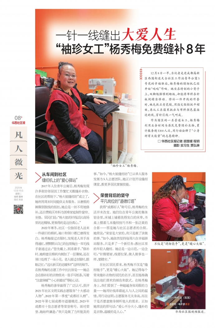 获得“成都好人”称号后,杨秀梅的生活并未改变。她仍住在青年公寓的集体宿舍里,床铺上铺着洗得发白的床单,书桌上摆着几本缝纫技巧书和一张泛黄的合影——那是她与社区志愿者的合照。她常说:“荣誉是大家的,我只是做了该做的事。”如今,她依然坚持每周六在幸福驿站服务,只是多了一个新任务:教社区里的年轻人缝纫。她总是一边示范,一边念叨:“针脚要密,线要拉紧,做人做事也一样,要踏实。”