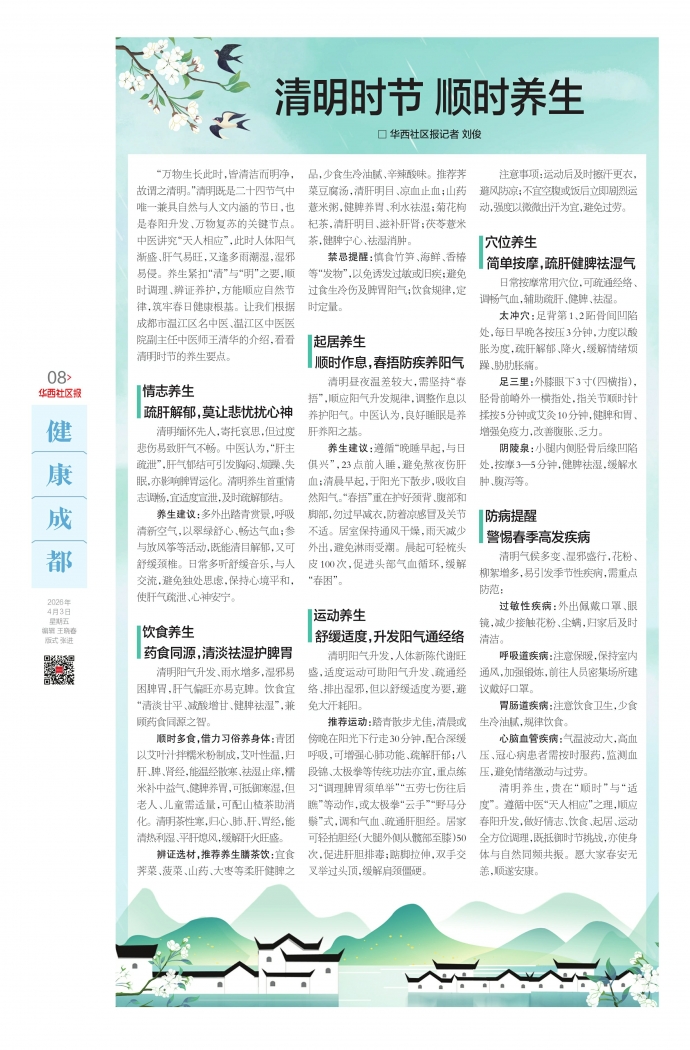 “万物生长此时,皆清洁而明净,故谓之清明。”清明既是二十四节气中唯一兼具自然与人文内涵的节日,也是春阳升发、万物复苏的关键节点。中医讲究“天人相应”,此时人体阳气渐盛、肝气易旺,又逢多雨潮湿,湿邪易侵。养生紧扣“清”与“明”之要,顺时调理、辨证养护,方能顺应自然节律,筑牢春日健康根基。让我们根据成都市温江区名中医、温江区中医医院副主任中医师王清华的介绍,看看清明时节的养生要点。