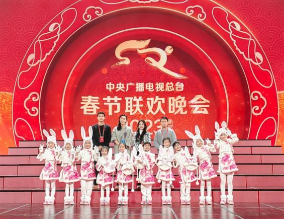 刘超(后排左二)和果果合唱团在2023年央视春晚现场。