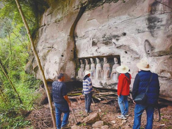 普查队员观察新发现的石窟寺点位。图据安岳石窟研究院官方公众号