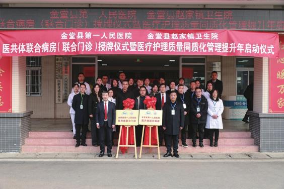 1月3日,成都市金堂县第一人民医院(华西金堂医院)医共体全科医学科联合病房(联合门诊)授牌仪式暨医疗护理质量同质化管理提升年启动仪式,在金堂县赵家镇卫生院举行。金堂县卫健局、金堂县第一人民医院、金堂县赵家镇卫生院代表参加。此次活动旨在全面推进紧密型县域医共体建设,推动医疗资源下沉,提升服务质量。