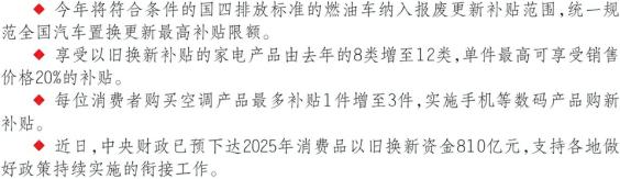 财政部经济建设司司长符金陵表示,近日,中央财政已预下达2025年消费品以旧换新资金810亿元,支持各地做好政策持续实施的衔接工作。同时,对资金需求量大、社会关注度高的部分领域,进一步扩大实施范围、提高补助标准。
