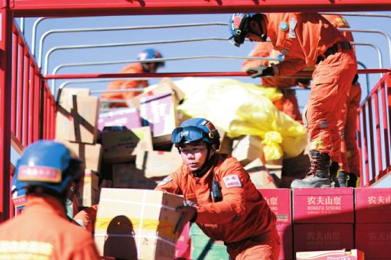 1月9日,救援人员在日喀则市拉孜县拉孜镇措布村卸载救灾物资。新华社发