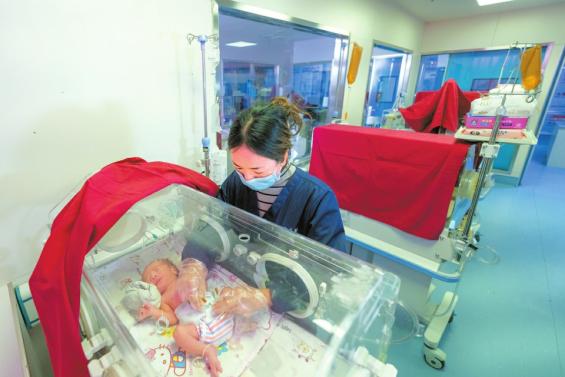 1月9日,日喀则市人民医院新生儿科护士在为定日县6.8级地震后来自震中的第一个新生儿换尿布。 新华社发