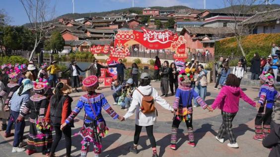 春节期间,游客在迤沙拉村感受当地民俗。图据仁和融媒