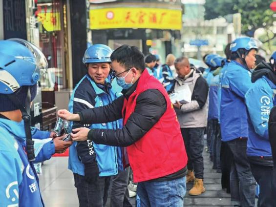 志愿者为外卖骑手分发中药和口罩。