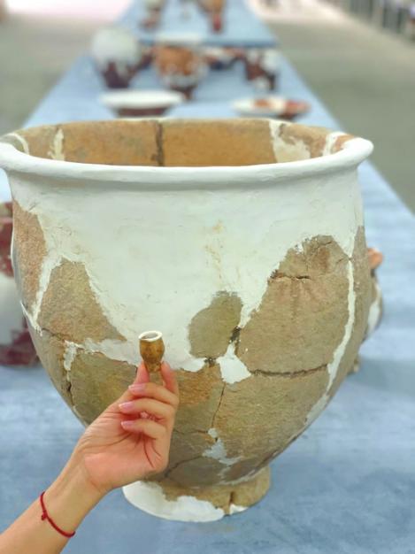 最大的陶器是一口直径46厘米的陶缸。缸里塞进了15件陶器。