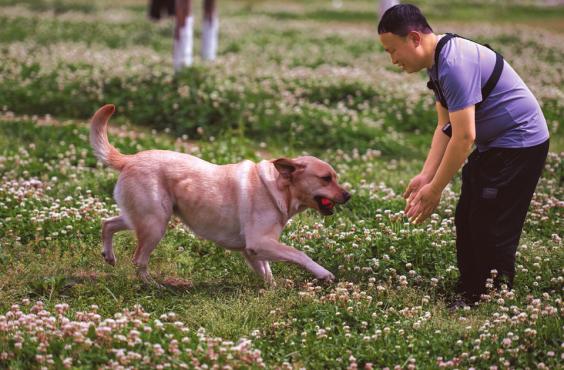 成都青龙湖湿地公园的草地上,白色的野花疯长,视力障碍人士兰海波正在和导盲犬“拿铁”玩小球。他做了一个假动作后,把球抛向远方,已经提前“启动”的“拿铁”迅速变向,把小球叼回来放到兰海波手里,然后兰海波会对着“拿铁”耳朵说:“好孩子!”