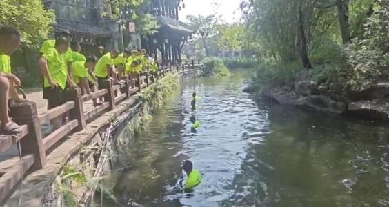 上午10点,队员们分别站在龙舟两侧,徒手将龙舟抬起,转移到黄龙溪景区内的龙潭湖中,暂时让龙舟“休眠”。他们将沙袋放入船舱之中,队员们齐心协力,让龙舟沉入水下。“水不深,只有1米多。”