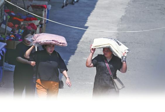 6月12日,成都人民北路,路人顶着刚买的被单防晒。 杨涛摄