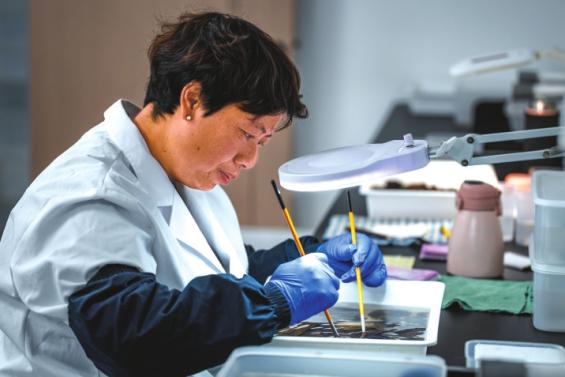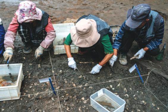 考古工作者在云南河泊所遗址现场进行清理发掘工作。