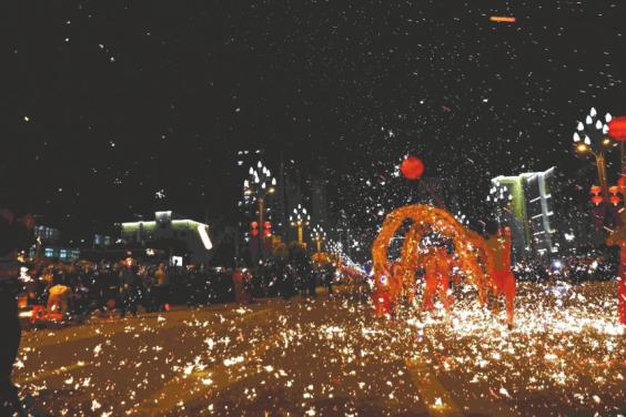 甘棠火龙表演,舞龙者矫健的身姿与火龙融为一体。图据开江融媒