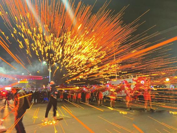 耍火龙表演包含请龙参神、祭龙请饮、赐福烧花、送龙归海四个环节,犹如四道韵味各异的文化盛宴。其中“赐福烧花”最为震撼——熔化的铁水击打出璀璨火花,火龙在漫天飞舞的“火雨”中翻腾穿梭。舞龙者矫健的身姿与火龙融为一体,在火花与铁水交织的绚烂中,演绎着力量与灵动的完美结合。从华灯初上到夜深人静,观众的视线追随着这场视觉盛宴,不愿错过每一个精彩瞬间。