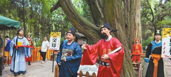 “走马点树,验数交印。”翠云廊景区内,一场复刻明代官吏交接场景的沉浸式演出吸引游客驻足观赏。身着官服的“离任县令”与“新任县令”手持古柏清单,逐棵清点确认……这幕《点树交印》实景剧,正是剑阁县传承古制的生动写照。