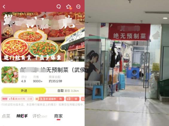 外卖平台上使用AI门头图的外卖店(左)与记者探访的真实店铺(右)大相径庭。