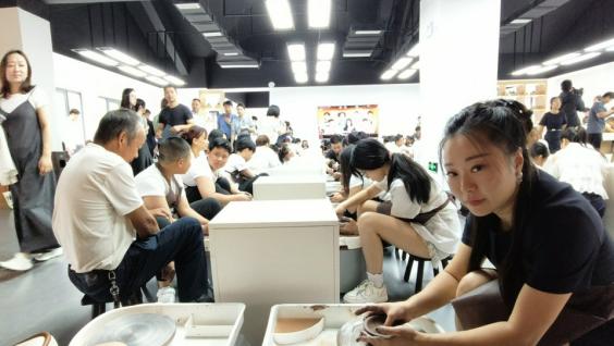 街区的土陶文化艺术馆,是当地打造研学游的一个重要承载地,很多孩子正在体验土陶制作,泥土坯子在孩子们手中逐渐变化为成型的陶器,不少家长在一旁耐心陪伴。见此,采访团记者也跃跃欲试,沉浸式体验了土陶制作。