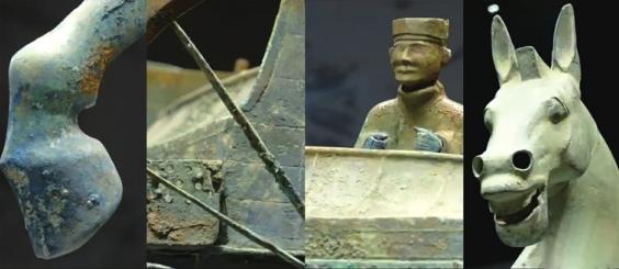 专家研究发现,资阳铜车马的工艺细节令人叹为观止。马身采用汉代常见的“分铸法”分段铸造,各部分衔接自然、浑然一体,展现出当时高超的铸造技艺。动态之美,在铜马的造型上体现得淋漓尽致。从现存马身来看,颈部肌肉因发力而隆起,四肢定格于“欲行又止”的刹那姿态,静中寓动,气势逼人。更精妙的是对驭手的刻画:呈跪坐姿态,右手紧握缰绳,指节间的力度清晰可辨,眼神平视前方,与铜马的动势彼此呼应,共同构成一幅张力十足、“人、车、马互动”的生动场景。