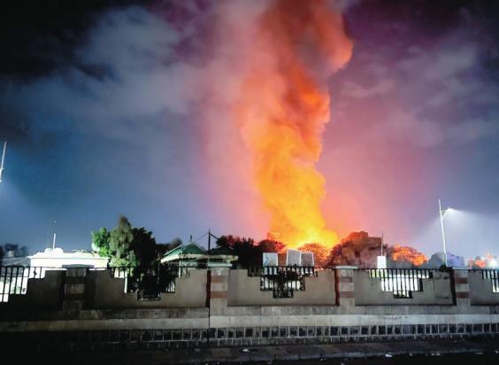 2025年3月19日,也门首都萨那一处地点遭到美军空袭后升起浓烟和火焰。图据新华社客户端