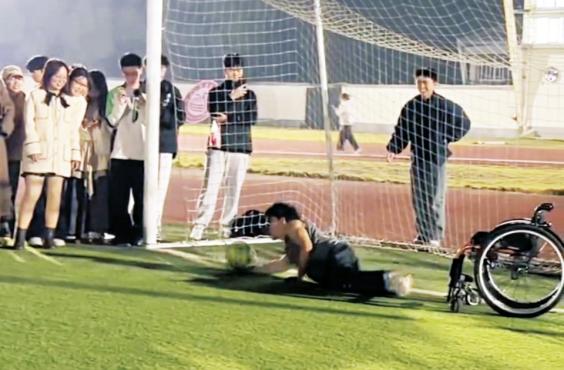 起初,同学们都“脚下留情”,将球轻轻踢向马尚在。良田见状,朝场上喊道:“别把他当人,往死里踢。”这句看似粗粝的玩笑,卸下了大家心里的“负担”,开始认真射门。“当大家把我当正常人对待时,我才真的感觉好玩。”马尚在也彻底投入,一次次用双臂的力量将自己从轮椅上“抛”出去扑救,又一次次侧翻在地。他爬起来,自己翻上轮椅,目光紧紧追着下一颗球。不知失败了多少次后,他终于判断对了方向,奋力一扑,将球挡在了球门外。瞬间,全场沸腾,所有人欢呼着冲向他,将他连人带轮椅一起举起。