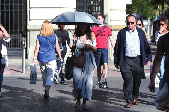 2025年,时至9月,西班牙高温仍在继续。在马德里,一名路人在阳光下打着伞行走。