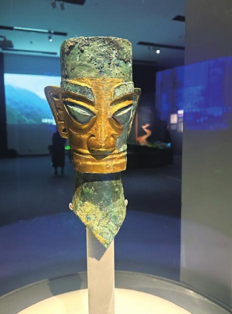 在展览的序厅中,人们最熟悉的三星堆形象之一——戴金面罩铜人头像,吸引络绎不绝的观众驻足观赏。戴金面罩铜人头像出土于三星堆遗址二号祭祀坑,金箔与青铜的结合,让这件青铜像显得神奇而华贵。