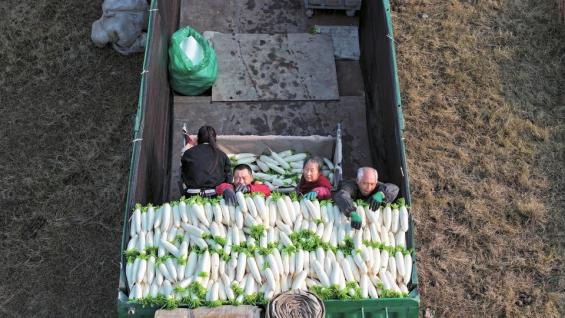 1月17日,湖北经销商徐先生再次来到蓬溪县红江镇,在地头监督工人打包萝卜。长短均匀的白萝卜被装袋码齐,静待装车。48小时后,这批萝卜将出现在广东的菜市场。