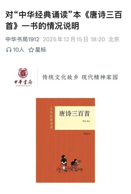 《唐诗三百首》被纠错后中华书局回应。中华书局微信公众号截图