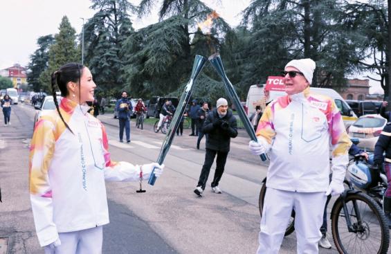 1月19日,谷爱凌(左)在意大利伦巴第大区参与米兰冬奥会火炬传递。新华社发