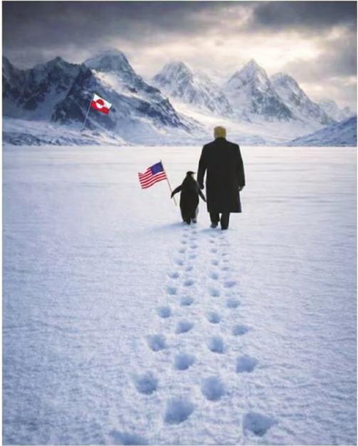 在美国政府持续施压要求控制格陵兰岛之际,白宫1月24日在社交媒体平台X上发布了一张人工智能合成图片,内容是美国总统特朗普与一只举着美国国旗的企鹅一起走在冰天雪地中,远处冰原上还插着一面丹麦自治领地格陵兰岛旗,图片配文“拥抱企鹅”。