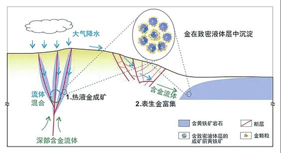 热液成矿与表生富集过程中致密液体层内金富集的示意图。