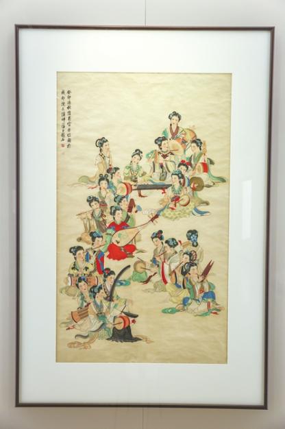 现场,戴媛媛特别提到了两件作品,一件是凝聚赵蕴玉十年心血,堪称工笔典范的《蜀宫乐伎图》。这是1948年赵蕴玉随张大千探访永陵后,通过十年的实地写生、器乐研究、推敲修改后完成的工笔重彩名作。画中22位乐伎姿态生动、细节考究,成为现代工笔人物画典范。“此画共有3个版本,此次在成博展出的是赵蕴玉自己最满意的一幅。”